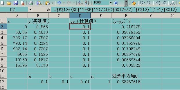 6.点击确定后。求解。可得到a,b,c,n以及最小残差平方和Q 到此曲线拟合参数确定。 | a | b | c | n | 残差平方和Q | | 0.1676 | 0.5653 | 0.0475 | 1.5293 | 0.0005 |